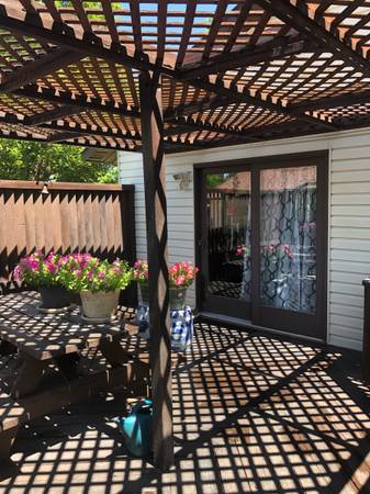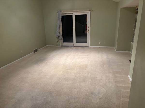 The carpeted living room has vaulted ceilings, a large bay window with wooden blinds, large sliding patio doors that lead to a spacious wood deck with a picnic table for entertaining and relaxing. Perfect for enjoying pots of flowers in summer.