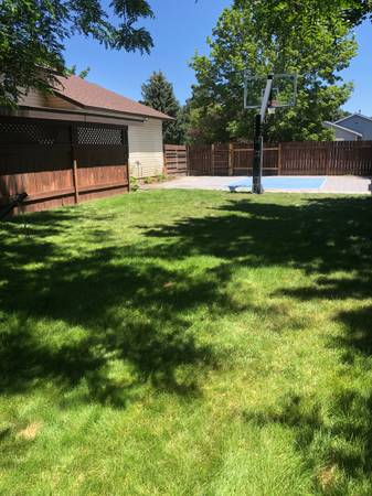 Outside in the backyard is secured by a wooden fence, for tons of privacy. It has a large basketball standard and a cool blue court, a covered patio, a side wooden deck patio, a big green grassy area, and a shade tree, for relaxing after work.