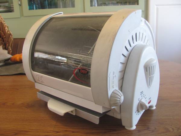 George Foreman "Baby George" Rotisserie Oven; White in color; Comes with Chicken or roast cooking spindle and basket spindle; Window allows observation of cooking process and is removeable for cleaning; Easy clean removeable drip tray; 0 to 180 minute timer; Suction cup feet to prevent tip-over; 120 volt, 60 Hz, 950 watt; This unit works really well; Price is only $15.00 cash; Call or text Rex @ show contact info
