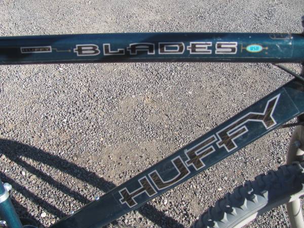 24" Huffy "Blades" 18 Speed Mountain Bike; Green/Bronze in color; Huffy Index System equipped with indexed thumb shifters; Caliper brakes front and rear; 24" X 2.10" Gray aggressive tread tires on bronze wheels; Flat downhill handlebars with end bars and cushion handgrips; Upgraded seat; Reflector set and integral kickstand complete this great riding mountain bike; Price is only $75.00 cash; Call or text Rex @ show contact info