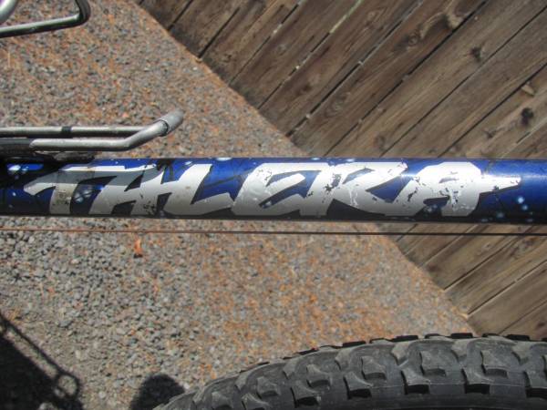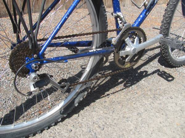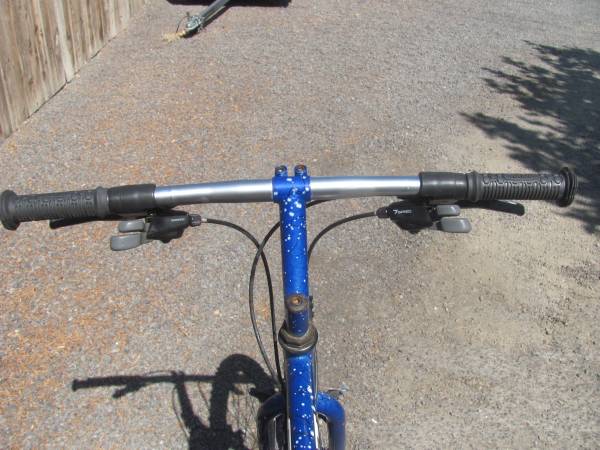 26" GT Alterra "Talera" 21 Speed Mountain Bike; Speckled Blue in color; Shimano Deore LX equipped with Shimano Rapid Fire indexed shifters; Linear-pull cantilever brakes with Shimano 200 CS brake handles; Upgraded 26" X 1.95" aggressive tread tires on Araya alloy wheels with quick release axles; 22" Chro-Moly Tange tubing frame; Flat downhill alloy handlebars with new NEON handgrips; Upgraded WTB seat with quick release seat post clamp; Equipped with a rear alloy luggage rack; This great riding bike is complete with alloy water bottle rack, reflector set, and an alloy kickstand; Ready to ride; Price is only $169.00 cash; Call or text Rex @ show contact info