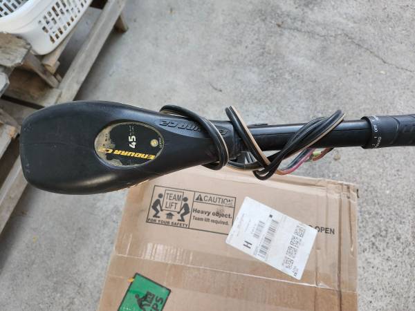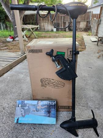 New in the box. Barely used trolling motor. Not that new and used it on our other boat a violet times. Just getting old and don't go anymore. New mount for motor. Paddles and rod holders. Never used it, just want to sell it. Has hard floor . And inflatable seats.