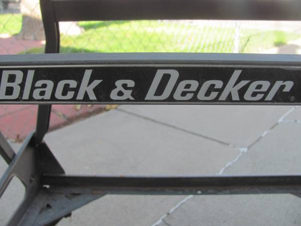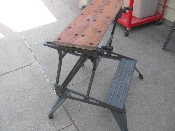 Black & Decker Deluxe Dual Height WorkMate; Gray/wood in color; Capacity: 350# max; Model #79-001; Easy clamp work surfaces; Non-marring feet; Dimensions: 31" wide X 28" deep X 32" high (and 16" high); Folds easily for compact transport and storage; Price is only $35.00 cash; Call or text Rex @ show contact info