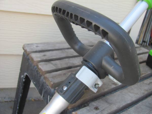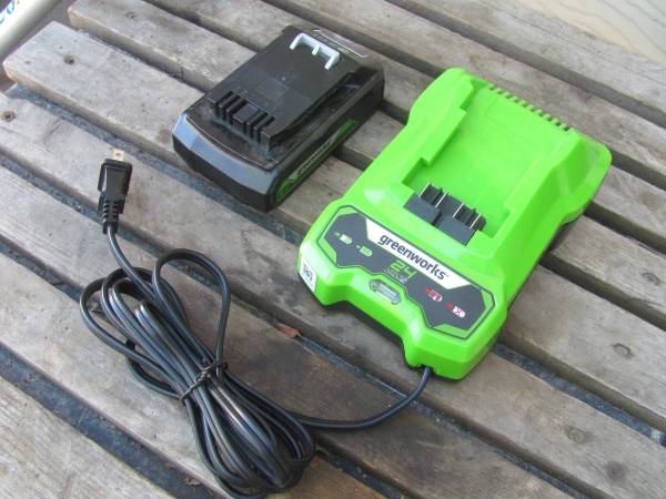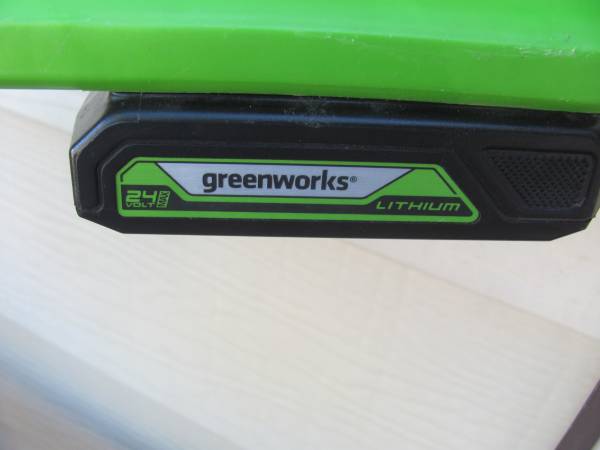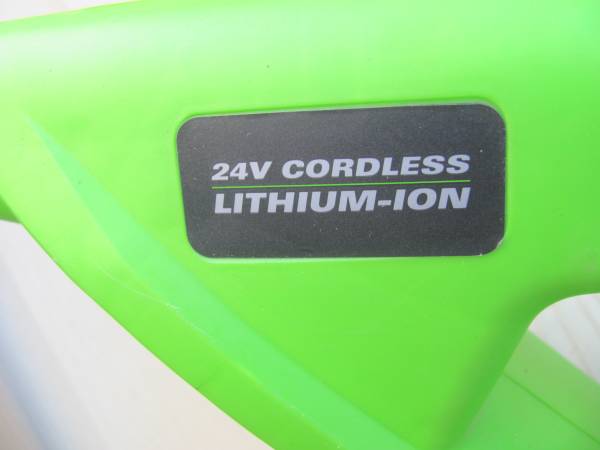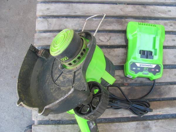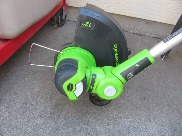 Greenworks Cordless Electric String Trimmer; Green/Black/Sliver in color; 12" cutting diameter; Automatic .065" line feedhead; cutting head rotates 90 degrees and swivels to 4 positions; comes with a 24 volt 2AH Lithium Ion battery and charger; adjustable length handle; Trimmer works very well. Price is only $49.00 cash; Call or text Rex @ show contact info