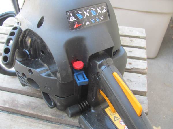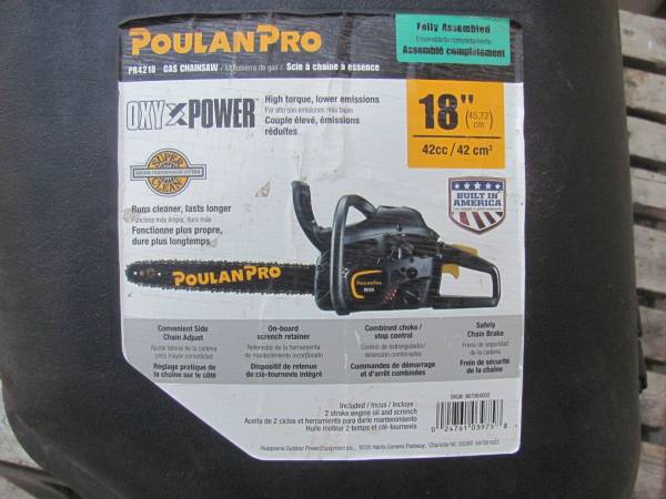 Poulan Pro 18" Gas Powered Chain Saw with Dedicated Poly Case; Black/Orange in color; 18" roller tip bar with a freshly sharpened Oregon chain; Powered by a 42 cc 2 stroke gasoline engine equipped with a primer bulb and a manual choke for easy starting; Also equipped with an anti-kickback chain brake; Automatic chain oiler; Saw has been serviced: Chain sharpened, roller tip lubricated, air filter cleaned, Fuel and bar oil reservoirs topped off, and cleaned throughout; Saw starts easily and runs/cuts excellent; Price is only $110.00 cash; Call or text Rex @ show contact info
