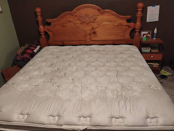 King size used mattress. Available after Jan 7th. We are upgrading. It is a non-smoking home. We do have a dog and a cat, but we use a cover on the mattress. We will be keeping our mattress cover, so you may want to purchase your own cover. We found it's on sale for $22 online on Walmart for a new cover.