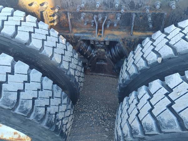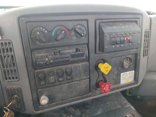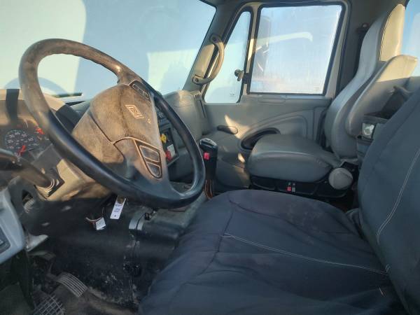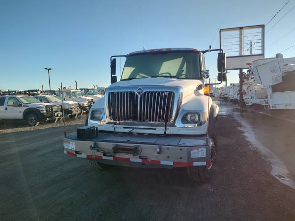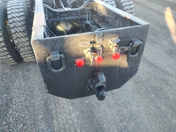 2003 International 7600 cab and chassis, 370 horsepower ISM Cummins diesel engine, 13 speed manual transmission, 116,000 miles, 9,600 hours, engine brake, differential lock, 56,000 GVW, Hendrickson pad suspension, air to the rear, pintle hitch, PTO, 120" cab to trunnion, 225" total frame, good tires, former municipal truck