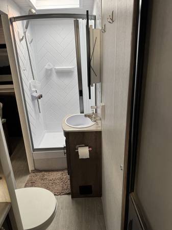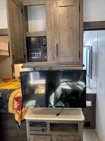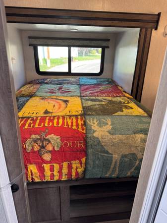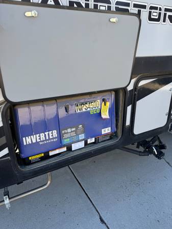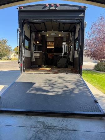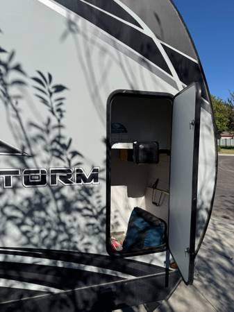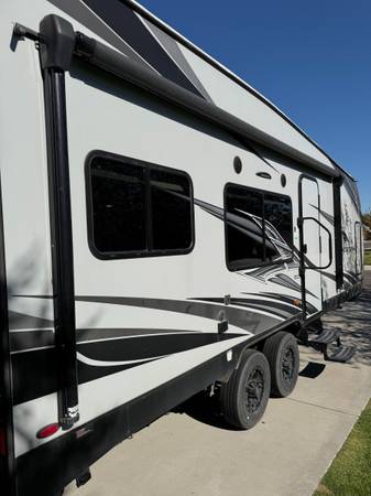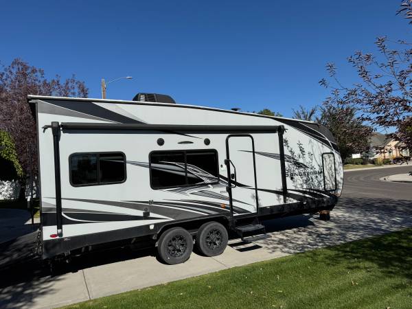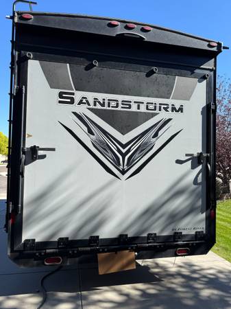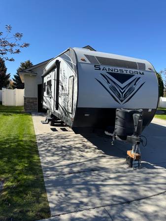 2022 Forest River 24-foot Sandstorm Toy Hauler. This travel trailer is in great condition with many improvements made. Also, just put $1,200 worth of 12-ply tires on it 3 months back. Not shown in picture (in toy hauler section back of trailer) is a second drop down queen bed and two bench seats and large table that have never been used but nice to have and all works off electric (no manual work to set up). It has fuel station, solar panels, one slide out, 2 batteries, 2 large propane tanks, large awning, TV, large fridge, freezer, power stabilizer jacks, outside speakers, outside propane BBQ plug, AC & furnace, oven, microwave, 3 burner stove top, nice custom queen master bed, great counter space & protective exterior armor guard from dealer (extra $1,527) to mention a few items. Paid $63,229 for it new and asking $42,000. Have original purchase receipt and the title in hand. Can text or call 208 - 3 two zero - 0 nine 00.